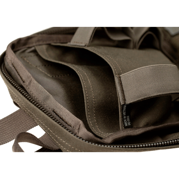 Wewnątrz posiada kieszenie i gumowe taśmy w celu organizacji materiałów opatrunkowych.