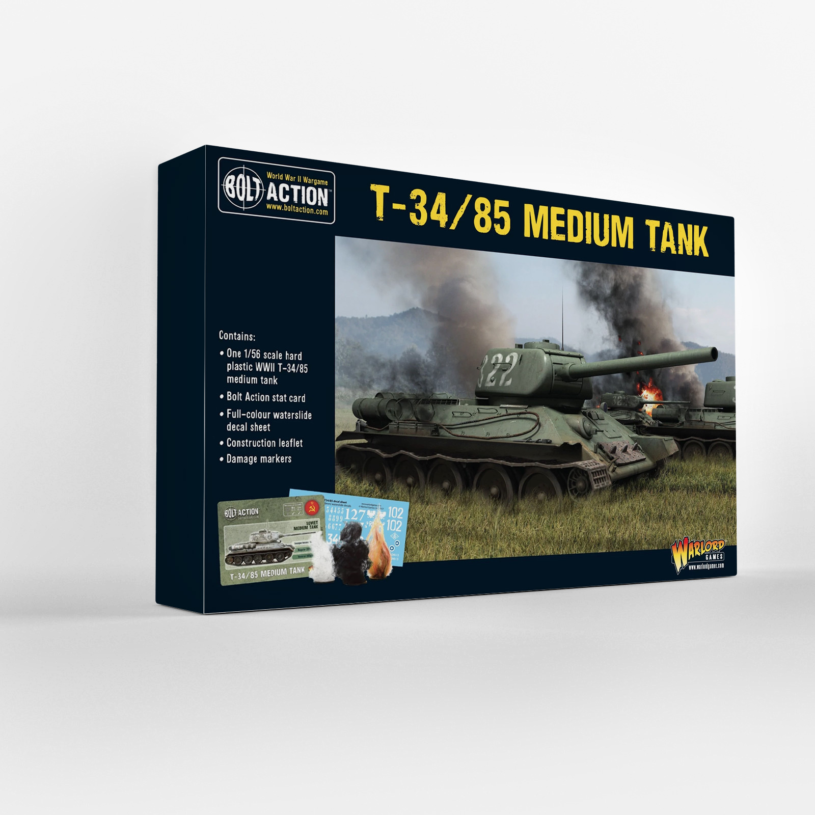 - Zawartość Pudełka: 1 plastikowy model czołgu T-34/85, karta statystyk Bolt Action, znaczniki uszkodzeń, ulotka i arkusz kalkomanii.
