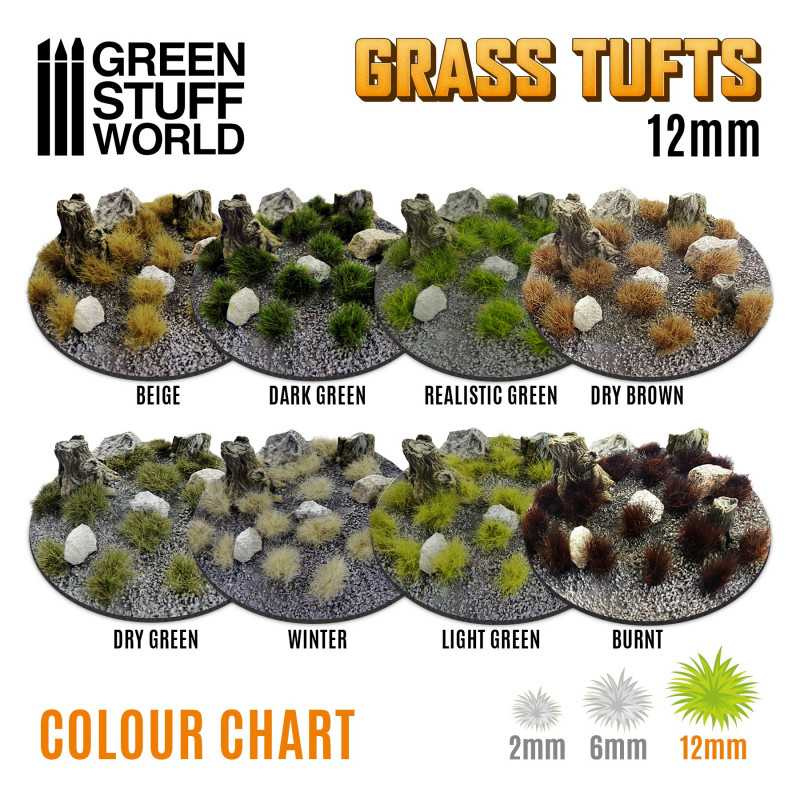 GSW Grass Tufts 12mm – Burnt to wysokiej jakości, samoprzylepne kępki trawy modelarskiej w odcieniach wypalonej, wysuszonej roślinności. To doskonały wybór do odwzorowania spalonych pól, suchych stepów, pustkowi i terenów po bitwie, dodających realizmu Twoim podstawkom, makietom czy dioramom.