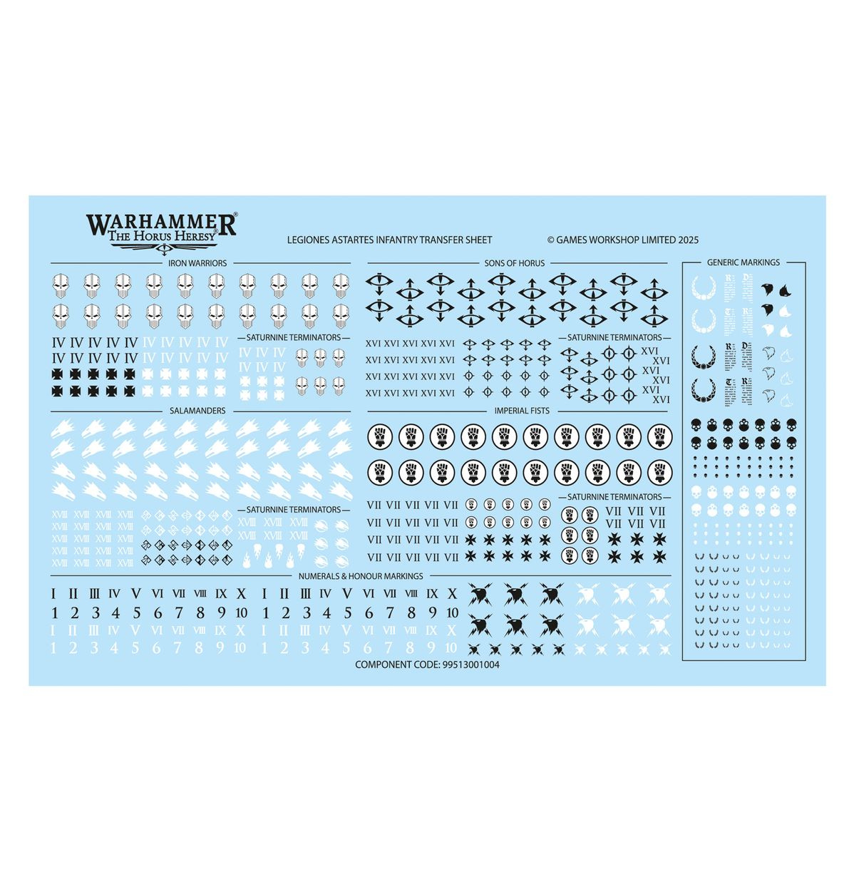 1x arkusz kalkomanii Horus Heresy Legion Infantry z 618 oznaczeniami Legionów (Sons of Horus, Imperial Fists, Iron Warriors, Salamanders)
