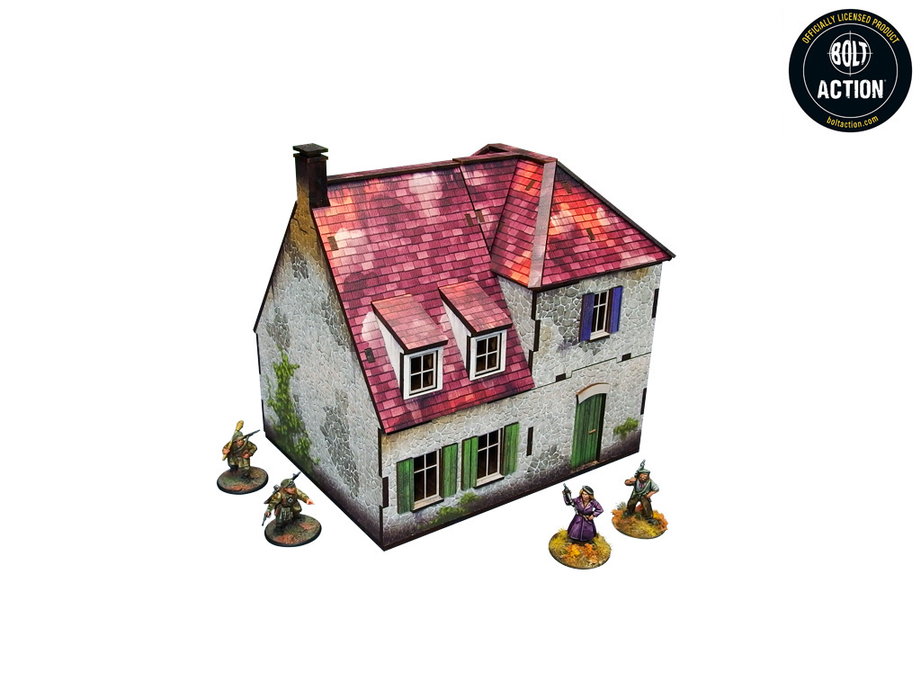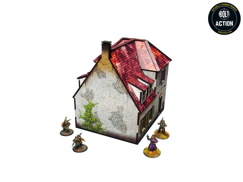 Doskonale odwzorowana chata dwupoziomowa z okresu II wojny światowej, pomalowana wielobarwnie (druk UV), z kolorowymi wnętrzami, możliwością usunięcia poziomów oraz zdemontowanym parterem w ruinie. Pomieści cały oddział piechoty wewnątrz. W zestawie przycięte przezroczyste panele okienne z akrylu. Opcja montażu z otwartymi lub zamkniętymi okiennicami i drzwiami.