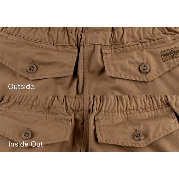 Główną cechą jest to, że po odwróceniu kombinezonu na drugą stronę pozostaje on w pełni sprawny – wszystkie kieszenie, getry, obszycia i szwy są zaprojektowane tak, aby można je było nosić podczas noszenia kombinezonu, niezależnie od twarzy.