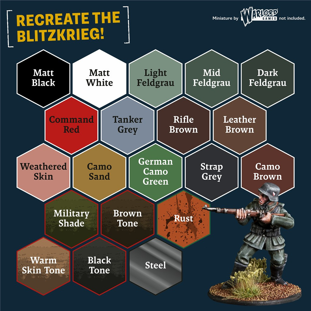 Zestaw World War II - German Paint Set od The Army Painter to profesjonalny zestaw farb zaprojektowany z myślą o malarzach figurek i modelarzach, którzy chcą z maksymalną dokładnością odwzorować barwy niemieckich sił zbrojnych z okresu II wojny światowej. Dzięki współpracy z historykami wojskowości, kolory zestawu wiernie oddają realia frontu – od mundurów piechoty, przez sprzęt Luftwaffe, aż po charakterystyczne barwy kamuflażu pojazdów.