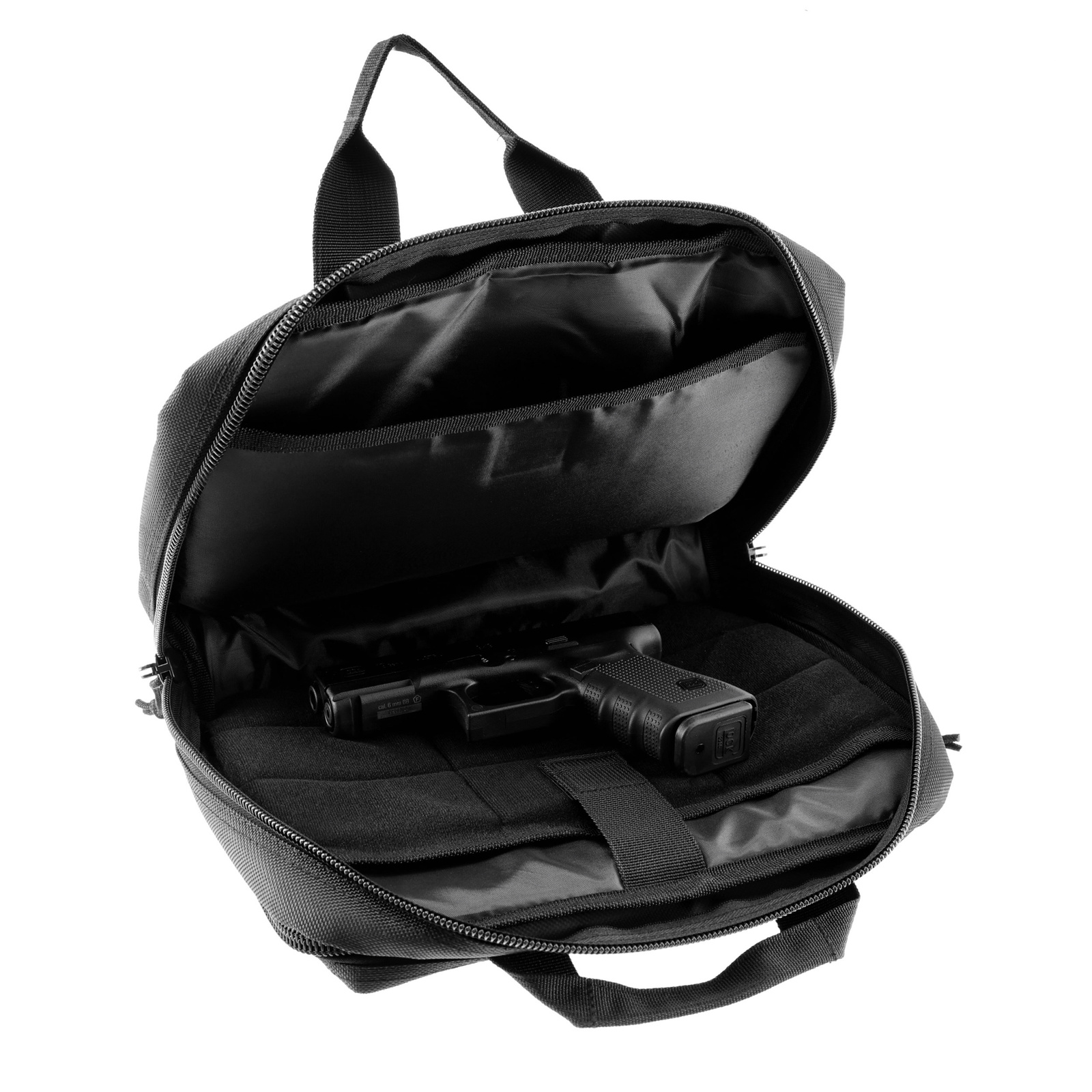 Wnętrze walizki wyłożono gęstą, profilowaną pianką, która chroni broń przed przemieszczaniem i przypadkowymi uszkodzeniami. Zamek szyfrowy, umieszczony z boku walizki, pozwala na bezpieczne przechowywanie pistoletów i zgodność z wymogami dotyczącymi transportu broni pneumatycznej.