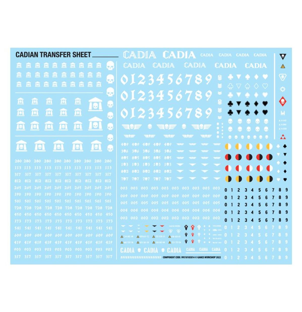 Ten zestaw składa się ze 131 plastikowych elementów i jest dostarczany z 10 okrągłymi podstawami Citadel 25 mm. W zestawie znajduje się także arkusz transferowy piechoty Cadian, zawierający 597 transferów zawierających cyfry, oznaczenia oddziałów i heraldykę pułku Cadian. Te miniatury są dostarczane niepomalowane i wymagają montażu – zalecamy użycie kleju do tworzyw sztucznych Citadel i farb Citadel Color.