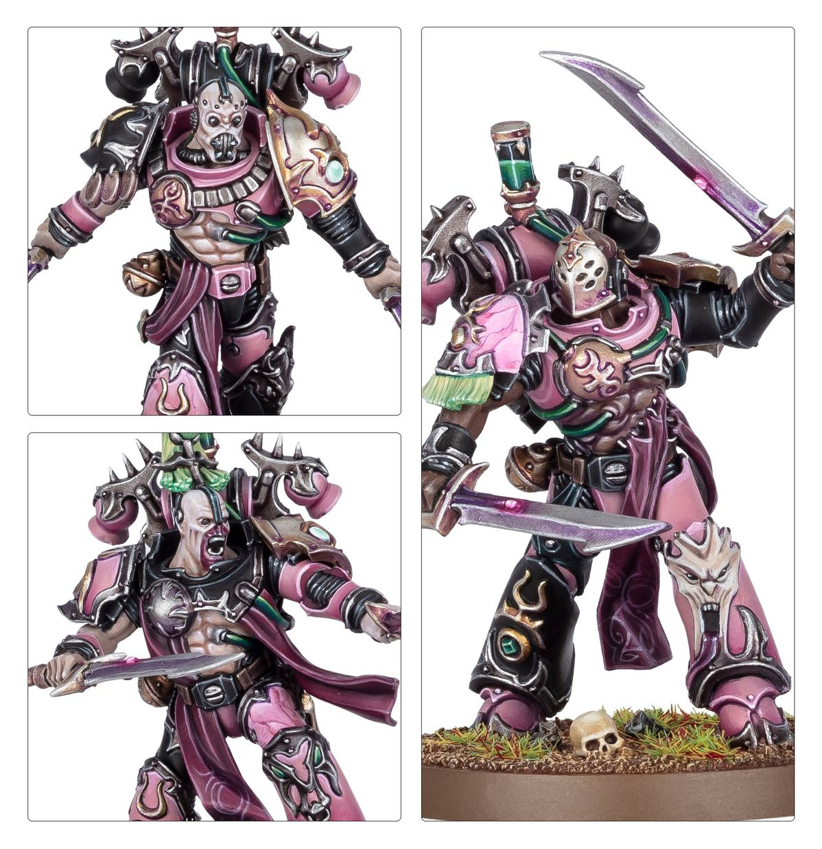 Malowanie: Polecamy użycie podkładu (Chaos Black lub Wraithbone), a następnie farb Citadel – np. Fulgrim Pink, Slaanesh Grey, Retributor Armour dla efektu luksusu i dekadencji.